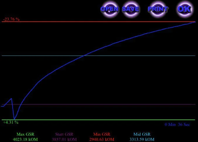 График вверху показывает значения КГР, или сопротивления между участками кожи, во времени. Ось ординат – обратная, а именно, более высокое сопротивление соответствует более низкому положению точки на графике.